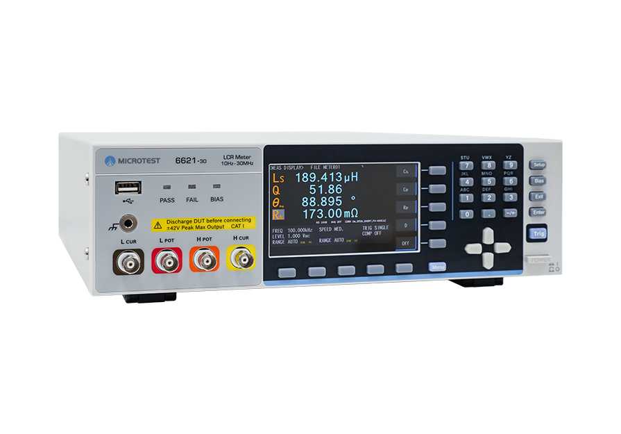 6621 của MicrotestMáy đo LCR (LCR Meter) cung cấp dải tần số rộng từ 10Hz đến 30MHz để đo đặc tính trở kháng của linh kiện và vật liệu. Các thông số đo được bao gồm |Z|, |Y|, θ, X, R, G, B, L, D, Q, DCR, C. Thiết bị hỗ trợ các giao diện truyền thông REMOTE/Handler/LAN/USB Host/USB Device/GPIB/RS-232, giúp thiết bị tương thích với thiết bị tự động hóa hoặc giao diện người-máy (PLC).