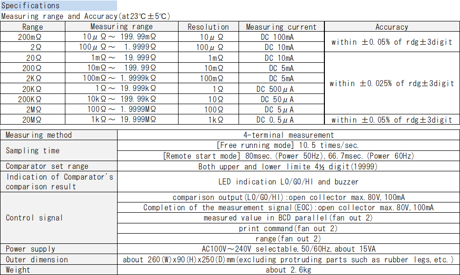Đèn LED chỉ báo [LO][GO][HI] Bộ so sánh kỹ thuật số tích hợp ●Độ phân giải: 10μΩ ●Phạm vi đo tối đa: 19,999MΩ ●Đo 4 đầu cuối ●Phương pháp chuyển đổi A/D dốc kép tốc độ cao ●Bộ so sánh kỹ thuật số và dữ liệu ra song song BCD ●Chức năng bù nhiệt độ cho dây đồng được trang bị theo tiêu chuẩn. (T.C) (Cảm biến: Tùy chọn) ●Dữ liệu ra song song BCD khả dụng |