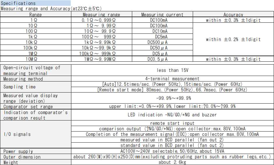 Máy kiểm tra phần trăm điện trở kỹ thuật số (8 dải)Bộ so sánh kỹ thuật số tích hợp chỉ báo LED [-NG][GO][+NG]● Phạm vi đo: 0,1Ω~9,99MΩ±99,9% ● Đo lường 4 đầu cuối ● Phương pháp chuyển đổi A/D dốc kép tốc độ cao. ● Chỉ báo phần trăm bằng thiết lập kỹ thuật số cho tiêu chuẩn giá trị điện trở ● Bộ so sánh kỹ thuật số tích hợp ● BCD song song ra ● Chức năng bù nhiệt độ (T.C) của dây đồng (Cảm biến: Tùy chọn) |